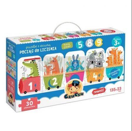 Składa się z 30 elementów, w tym 10 wyjmowanych kółeczek z cyframi. Kółeczka oraz elementy z pasażerami można dowolnie przekładać. Puzzle inspirują do poznawania cyfr i naukę liczenia do 10. Do zestawu dołączono poradnik pełen pomysłów na edukacyjną zabawę.