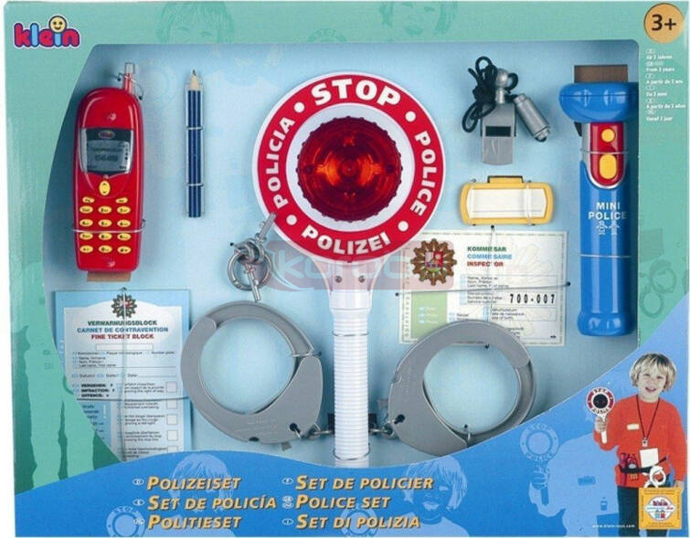 Zestaw policyjny od Klein'a składający się z 10 elementów, w tym kajdanek, latarki i świecącego lizaka policyjnego.