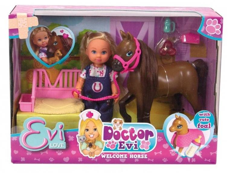 Dziewczynki lubią wcielać się w zawodowe role, zabawa w weterynarza to świetny sposób na zdobywanie nowych umiejętności i empatii dla zwierząt. Evi pomaga w narodzinach źrebaka, który mieści się w brzuchu klaczy. Zabawę dopełniają niezbędne dodatki jak kojec, pled i buteleczka dla źrebaka. Evi troskliwie karmi źrebaka butelką, którą można precyzyjnie mocować w rączkach laleczki za pomocą wypustek. Laleczka ma zginane w kolanach nóżki i ruchome nadgarstki.