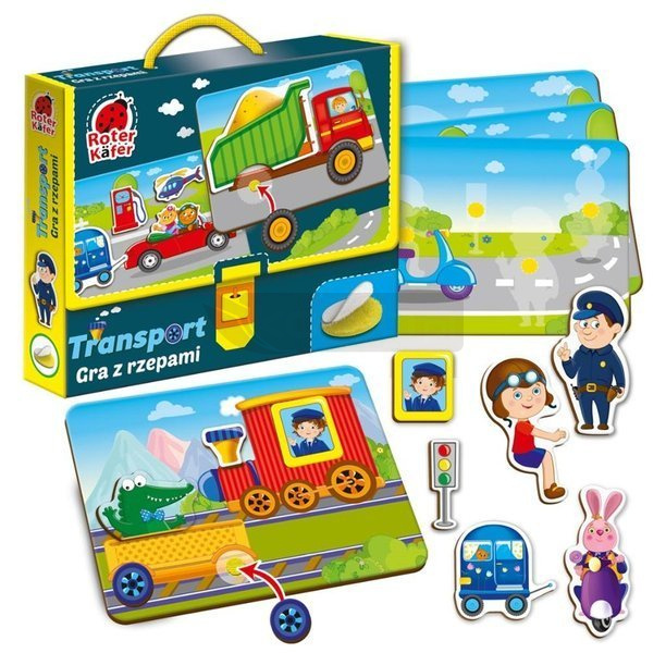 Poznawajcie rodzaje transportu w ciekawej formie gry! Zestaw: 4 plansze, 16 figurek, 32 rzepki