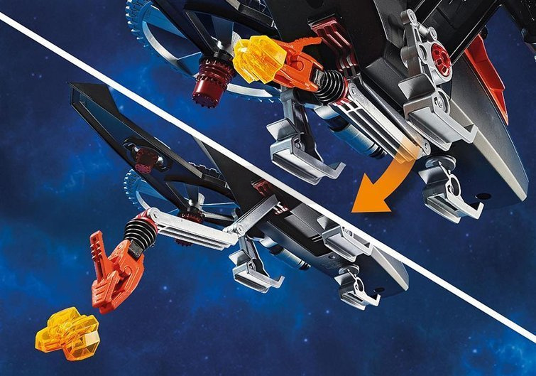 Playmobil Galaxy Helikopter piratów UWAGA! Kosmiczni Piraci atakują swoim helikopterem! Szybko, chować się, woła policjant. Kiedy ma zamiar uciec do swojego drona, dwa pociski już przelatują obok niego. Uff, było bardzo blisko. Szybko wskakuje na swojego drona i chwyta karabin. Ale kosmiczni piraci już ponownie go namierzyli i przygotowują się do strzału. Policjant szybko reaguje i strzela bezpośrednio do czerwonych urządzeń nawigacyjnych. Helikopter natychmiast opada na ziemię. Dwaj piraci wyczołgują się z samolotu i uciekają. Czy uciekną przed policjantem z kosmosu? Zestaw do zabawy zawiera trzy figurki PLAYMOBIL, kosmicznego policjanta i dwóch kosmicznych piratów, helikopter z dwiema wyrzutniami rakiet i obrotowymi wirnikami bojowymi oraz latający dron.