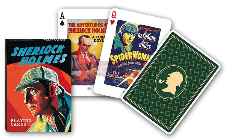 Karty do gry z oryginalnymi awersami, na których znajdziemy motywy z najsłynniejszym detektywem - Sherlockiem Holmes'em. Talia składa się z 54 plastikowanych kart o wymiarach 63 x 88 mm.
