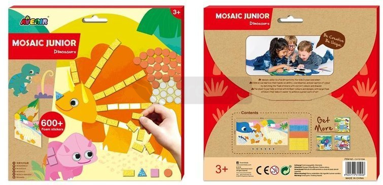 Twórz kolorowe mozaiki z dinozaurami! Duże piankowe naklejki ułatwiają wykonanie wspaniałego dzieła sztuki - wystarczy dopasować kolorowe naklejki do obrazka, aby uzyskać efekt, z którego można być dumnym. Dzieci mogą poprawiać swoją koordynację i postrzeganie kolorów, dopasowując naklejki piankowe do odpowiednich kolorów i kształtów. W zestawie: 2 obrazki do ozdobienia, piankowe naklejki, naklejki oczy, patyczek.