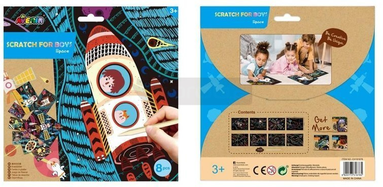 Avenir Scratch to zupełnie nowe podejście do prac ręcznych. Wyjątkowy arkusz, na którym tworzy się poprzez zdrapywanie warstwy wierzchniej, by odsłonić wielobarwną warstwę spodnią. Wydrapywanka to zabawka kreatywna najwyższych lotów, pozwalająca nie tylko tworzyć piękne prace, ale także dająca doświadczenia sensoryczne - dzięki użyciu odpowiedniego narzędzia i zachowywania się papieru podczas zabawy dziecko odbiera nowe wrażenia dotykowe. . W zestawie: 4 wydrapywanki, patyczek, kolorowe muliny.