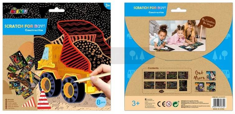 Avenir Scratch to zupełnie nowe podejście do prac ręcznych. Wyjątkowy arkusz, na którym tworzy się poprzez zdrapywanie warstwy wierzchniej, by odsłonić wielobarwną warstwę spodnią. Wydrapywanka to zabawka kreatywna najwyższych lotów, pozwalająca nie tylko tworzyć piękne prace, ale także dająca doświadczenia sensoryczne - dzięki użyciu odpowiedniego narzędzia i zachowywania się papieru podczas zabawy dziecko odbiera nowe wrażenia dotykowe. . W zestawie: 4 wydrapywanki, patyczek, kolorowe muliny.