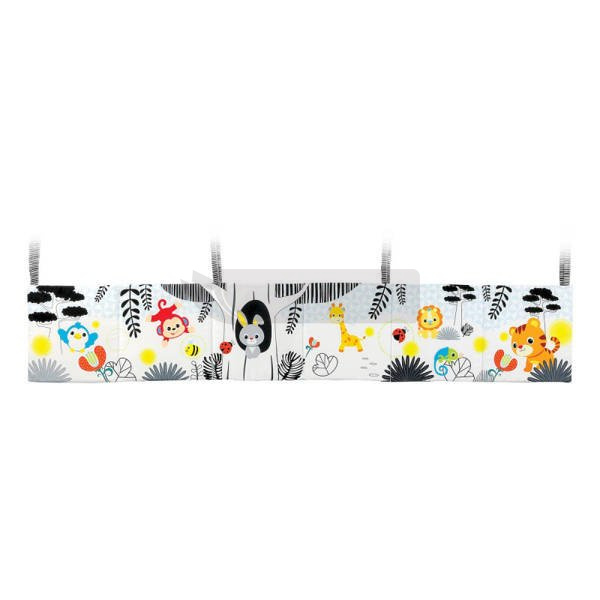 Obydwie strony ochraniaczy, są bogate w różne tekstury materiałów, na jednej z nich jest także bezpieczne plastikowe lusterko. Na każdej stronie książeczki znajdziemy inną postać, która kojarzy się z dzikim safari. Książeczka ma również grzechotkę, krzaczek a ku ku. Ochraniacz ma cztery punkty, które można przywiązać do łóżeczka.