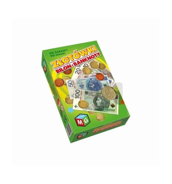 Imitacja polskich pieniędzy w bilonie i w banknotach. Produkt nadaje się doskonale do zabawy i może być wykorzystany jako atrakcyjny rekwizyt różnego rodzaju gier. Jest także cenną pomocą dydaktyczną w poznaniu pierwszych informacji na temat operacji pieniężnych. Zawartość pudełka: 25 banknotów 10 zł, 25 banknotów 20 zł, 25 banknotów 50 zł, 25 banknotów 100 zł, 25 banknotów 200 zł, 4 monety 5 zł, 4 monety 2 zł, 4 monety 1 zł, 4 monet 50 gr, 4 monety 20 gr, 4 monety 10 gr, 4 monety 5 gr, 4 monety 2 gr, 4 monety 1 gr.
