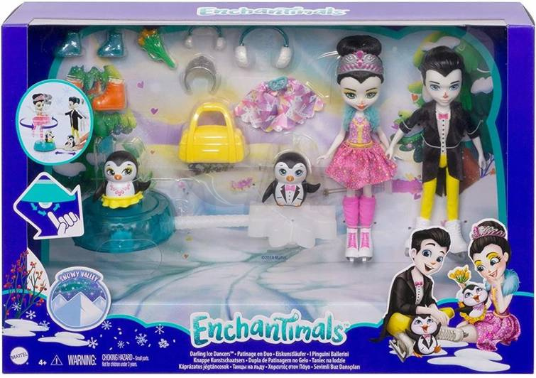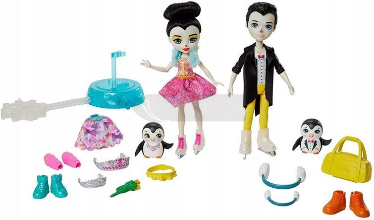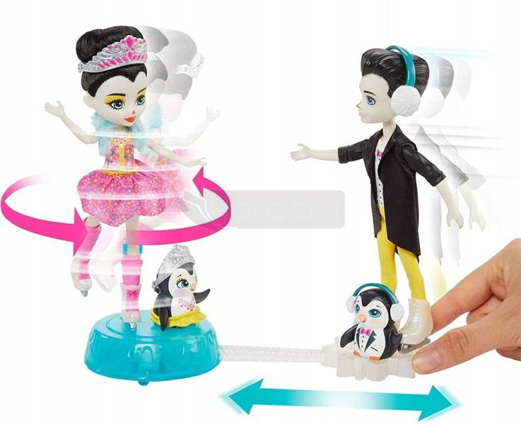 Jeźdź na łyżwach i kręć piruety z lalkami Preena Penguin™ i Patterson Penguin™! Pomóż tym łyżwiarzom Enchantimals™ wykonać ich popisowy numer. Wystarczy przyczepić lalki do podstawki. Następnie przesuwaj podstawkę po dowolnej gładkiej powierzchni. Podziwiaj ich „jazdę” i obserwuj, jak Preena Penguin™ kręci piruety! Lalki Enchantimals™ są ubrane w swoje najlepsze stroje z takimi dodatkami jak zdejmowana spódniczka, łyżwy czy tiara. W zestawie są też nauszniki, torba sportowa i buciki na zmianę, aby zabawa sunęła gładko na lodowisku i poza nim.