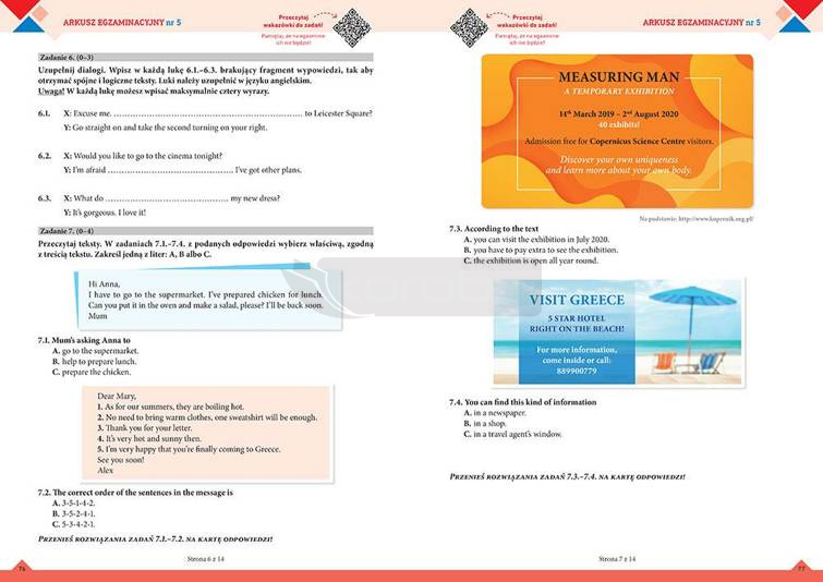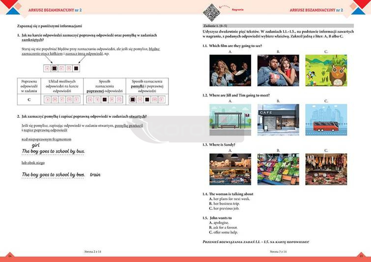 Ósmoklasista znajdzie tutaj wszystkie typy zadań, jakie pojawiają się na egzaminie - zadania sprawdzające rozumienie ze słuchu razem z nagraniami oraz zadania z zakresu rozumienia tekstu pisanego, zadania testujące umiejętności językowe, znajomość słownictwa, a także tworzenie krótkich wypowiedzi pisemnych.