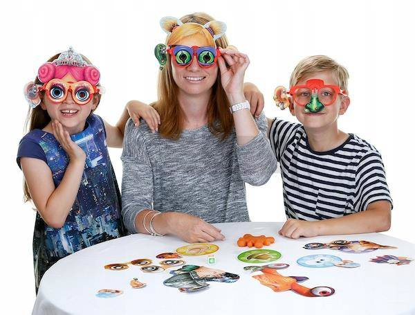 GOTOWI? OKULARY NA NOS! START! Jako pierwszy klepnij otwartą reką w kartę z symbolem, który został wyrzucony na kostce. Potem wyszukaj odpowiedni element maski dla innego gracza i przymocuj go do jego okularów. Ciekawe, kto jako pierwszy będzie wyglądał jak kompletny wariat? Zawartość zestawu: 4 pary okularów, 5 klipsów na nos, 10 klipsów na uszy, 1 piszczałka, 1 kostka, 4 karty do klepania, 25 elementów masek, 1 tabliczka z napisem „Stoopido”, dla przegranego