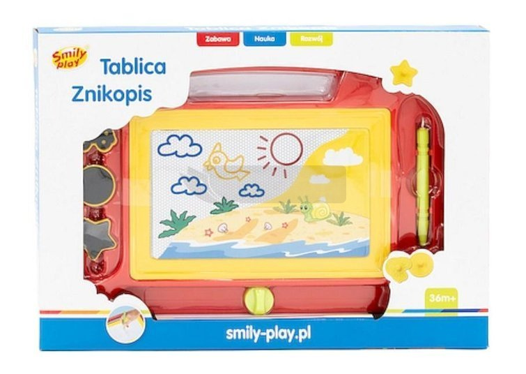 Tablice Znikopisy to edukacyjne zabawki wykorzystująca właściwości magnetyczne występujących w przyrodzie pierwiastków. Zabawa wykorzystuje fizyczne zjawisko przyciągania różnokolorowych, metalowych drobinek poprzez specjalny długopis magnetyczny. Dzięki czemu na tablicy powstają różnego rodzaju plastyczne kompozycje, które tworzą "magnetyczne rysunki". Niewielkie pole magnetyczne, wytwarzane przez umieszczone w długopisie i stempelkach magnesy, namagnesowuje powierzchnię tablicy - przez co drobinki metalu "przyklejają się" tworząc wzór zgodny z przesunięciami długopisu / przyłożenia stempelków. Zasada działania jest dokładnie taka sama jak w pierwszych tego typu tablicach magnetycznych. Specjalny suwak pozwala na "wymazanie" malowidła i po chwili kolejny obraz można tworzyć od początku. Tablica Znikopis: wygodny uchwyt długopis magnetyczny kolorowe stempelki Tablica Znikopis pomaga rozwijać umiejętności Rozwój fizyczny rozwijając małą motorykę Specyfikacja: SP83441 Wiek: 3l+ Wymiary produktu: szer. 38 cm, wys. 27 cm., gł. 4 cm Importer: Anek dla Dzieci