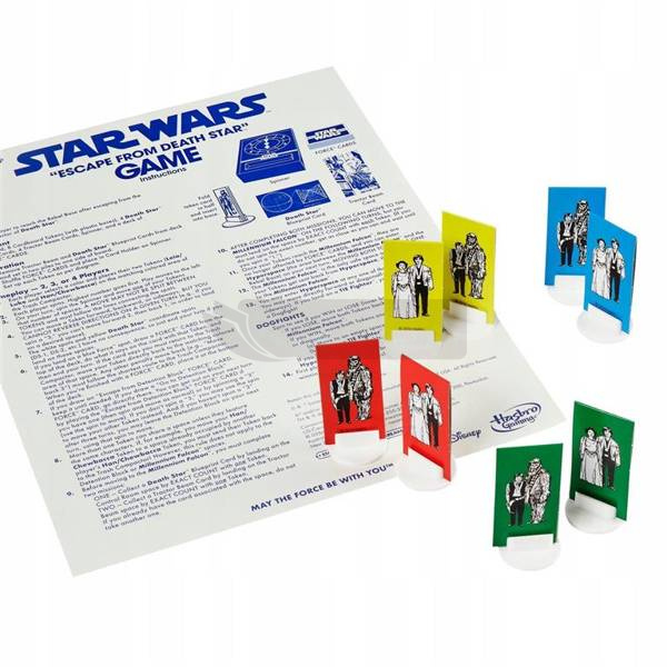 Odzyskaj wspomnienia dzięki tej retro wersji gry planszowej Ucieczka z Gwiazdy Śmierci. Gra oparta jest na oryginalnej grze planszowej Kennera wydanej w 1977 roku i zawiera ekskluzywną figurkę Grand Collection Moffa Tarkina z kolekcji Retro. Fani mogą przeżyć oryginalne chwile z Gwiezdnych wojen, pomagając swoim ulubionym bohaterom w ucieczce z kompaktora śmieci Gwiazdy Śmierci i przedostaniu się do Bazy Rebelii. Gracze mają za zadanie pomóc Lukeowi Skywalkerowi, księżniczce Lei, Hanowi Solo i Chewbacca w ucieczce na wolność. Błystka obraca ruchy graczy, ale muszą oni zdecydować, jakie przejścia należy podążać. Czy przyjmą skróty, które ryzykują spotkania z Mocą? Pierwszy gracz, który przebije się przez myśliwce TIE i osiągnie bazę Rebelii, wygrywa! Prawa autorskie i TM Lucasfilm Ltd. Hasbro Gaming i wszystkie powiązane warunki są znakami towarowymi Hasbro.