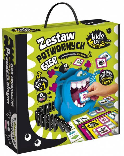 Zestaw pierwszych potwornych gier to trzy tradycyjne gry dla najmłodszych, które stymulują rozwój logicznego myślenia. W opakowaniu znajdują się karty do klasycznej gry pamięciowej, loteryjki oraz domino. To nie wszystko! Elementy pozwalają na złożenie trójwymiarowego potworka, który zjada karty do gry pamięciowej.