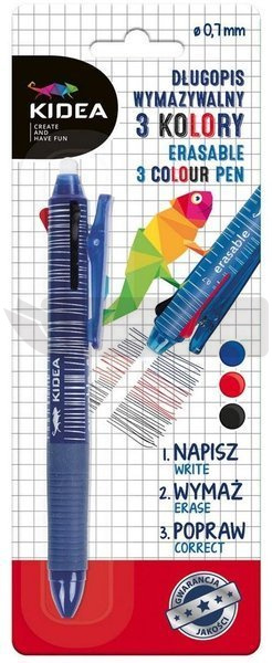 Nowość! Jedyny taki automatyczny, wymazywalny długopis z 3 różnokolorowymi wkładami. Jeden długopis i aż 3 kolory - niebieski, czerwony i czarny. Gumką w końcówce, można wymazać każdy popełniony podczas pisania błąd. Precyzyjna końcówka sprawia, że pisanie nim to przyjemność.