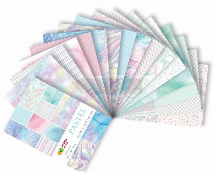Niezwykły zestaw 26 pastelowych motywów, tj. kropki, groszki, paski i kratki oraz delikatnych efektów akwarelowych, marblingowych i efektów z muśnięciami światła odbitego w wodzie. Doskonałe do tworzenia delikatnych dekoracji, laurek i zdobienia. Format A4. 15 ark. w bloku.