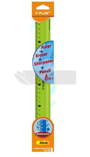 Linijka 4w1, 30 cm. Linijka, Gumka, temperówka, ołówek.