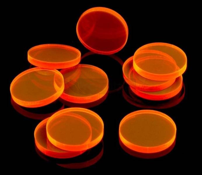 Żetony wykonane z pomarańczowego szkła akrylowego, fluorescencyjnego, o grubości 3 mm, średnica żetonu wynosi 22 mm. W opakowaniu jest 10 żetonów. Użyteczne w grach bitewnych, RPG, grach Print & Play, w prototypach gier planszowych, jako zamienniki elementów oraz przy wprowadzaniu własnych modyfikacji zasad do gier. Po żetonach można kreślić mazakami suchościeralnymi. Do czyszczenia PMMA (szkła akrylowego - plexi) nie należy używać żadnych środków na bazie alkoholi. Polecamy wodę z mydłem, a w przypadku silnych zabrudzeń cytrusowe środki czyszczące.