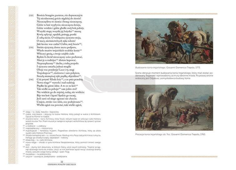 Przedstawiamy nowe wydanie Odprawy posłów greckich, będące częścią serii Kolorowa Klasyka. Zostało starannie opracowane pod względem merytorycznym i edytorskim - tekst uzupełniają reprodukcje dzieł malarskich przedstawiających bohaterów lub wydarzenia związane z akcją utworu takich jak obraz Pożar Troi, Daniela van Heila czy wizerunek Heleny Trojańskiej autorstwa Evelyn De Morgan. Ilustracje w połączeniu z elegancką okładką budują estetyczną całość. Polecamy!