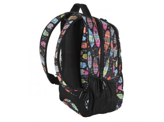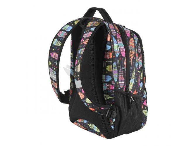 Plecak młodzieżowy, szkolny. Dwie pojemne komory, kieszeń przednia, 2 boczne kieszonki z siatki. Wzmocnione profilowane plecy, miękkie wygodne szelki. Wygodny uchwyt do przenoszenia i uszko do powieszenia. W komorze głównej przegroda (na laptop), w drugiej komorze organizer z kieszenią na zamek, uchwyt na klucze. Elementy odblaskowe dla większego bezpieczeństwa.