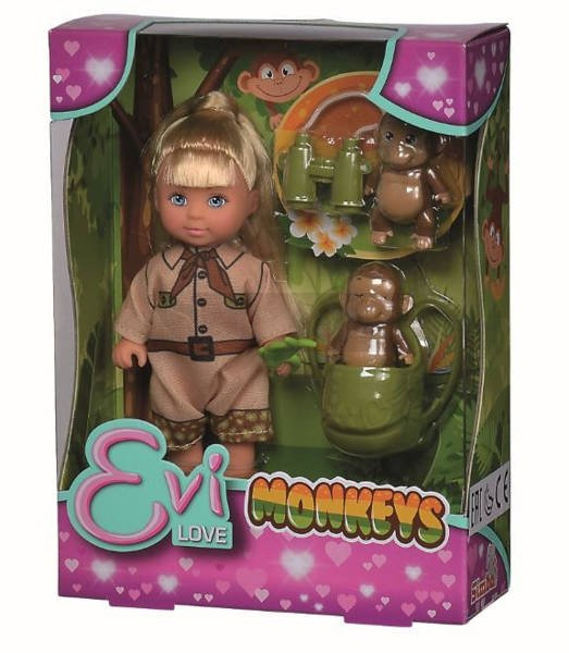 Laleczka Evi jako podróżniczka na egzotycznej wyprawie, zaopatrzona jest w lornetkę, wygodne obuwie i plecak, towarzyszą jej 2 sympatyczne małpki