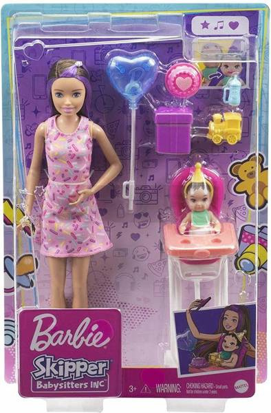 Lalki i zestawy do zabawy Barbie Skipper Babysitters Inc. zachęcają dzieci do rozwijania umiejętności opieki nad dziećmi. Dzięki temu zabawnemu zestawowi urodzinowemu dzieci mogą świętować tortem i karmić dziecko w swoim wysokim krzesełku. Jeśli laleczka zostanie umyta lodowatą wodą, na jej twarzy będą widoczne ślady ciasta, a ciepła woda sprawi, że znów będzie czysta! Prezent, który zawiera zabawkową lokomotywę i inne akcesoria imprezowe, zawsze otwiera nowe historie pełne troski i przyjemności. D zięki tak wielu akcesoriom w tym zestawie dzieci mogą odtwarzać niezliczone doświadczenia związane z opieką nad dziećmi. Wszystkie lalki Babysitters Inc. razem i związane z nimi zabawki zapewniają jeszcze więcej radości z opieki nad dziećmi z Barbie (wszystkie przedmioty są sprzedawane oddzielnie).