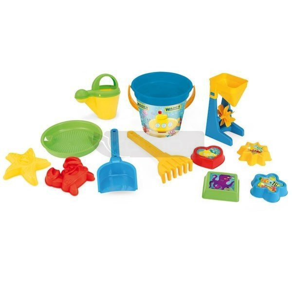 Zestaw zawiera 12 elementów: łopatkę, grabki, 6 foremek (krab, rozgwiazda, kwadrat, serduszko, gwiazdka, kwiatek), konewkę, młynek do piasku, sitko i wiaderko o ciekawej, grafice wykonanej metodą IML. Dzięki temu wytrzyma ona kontakt z wodą i słońcem. Całość w żywej, letniej kolorystyce, wyprodukowana w Polsce z nietoksycznych, bezpiecznych i wytrzymałych materiałów.