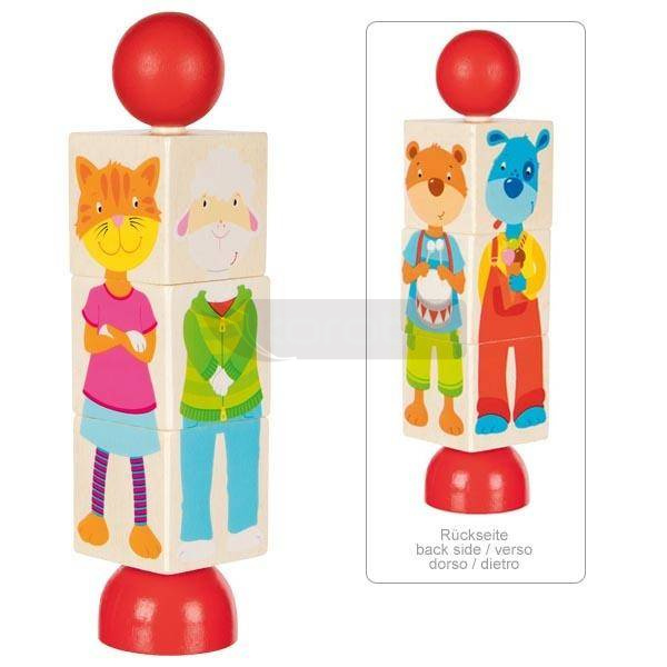 Niby tylko trzy klocki na kołku, ale ile różnych możliwości. Zabawa we właściwe układanie postaci to edukacyjna rozrywka, za to zabawniej jest obserwować, jak śmiesznie wyglądają postaci, których elementy nie pasują do siebie. Zabawa takimi puzzlami rozwija u dzieci zmysł obserwacji, motorykę małą i logiczne myślenie. Klocki wykonane są z drewna.