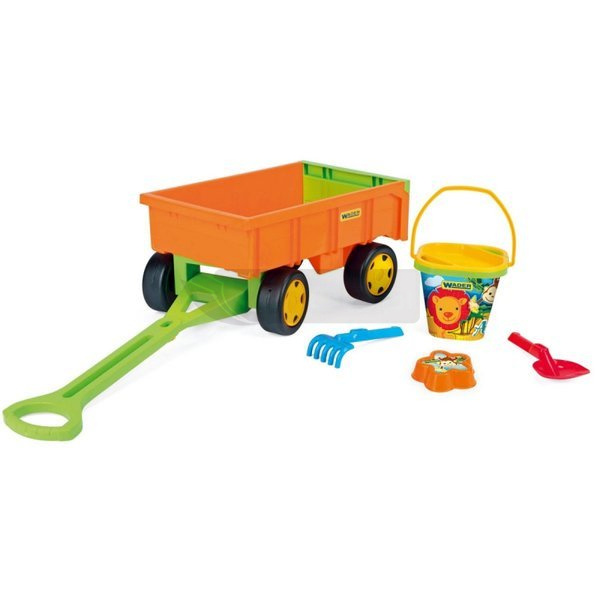 Wózek Przyczepa z Kompletem do Piasku to bezpieczny i wytrzymały wózek o nośności do 60 kg. Do zabawki dołączone jest letnie wyposażenie naszych milusińskich łopatka, grabki, foremka, sitko i wiaderko o ciekawej, grafice wykonanej metodą IML. Dzięki temu wytrzyma ona kontakt z wodą i słońcem. Całość w żywej, letniej kolorystyce, wyprodukowana w Polsce z nietoksycznych, bezpiecznych i wytrzymałych materiałów.