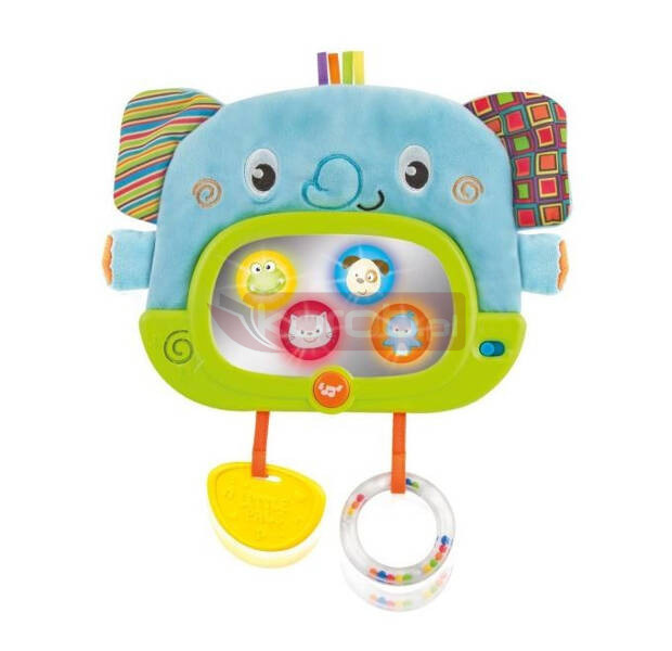 Słonik ma automatyczny wyłącznik (30 sek. w dzień i 3 minuty w nocy). Jest zabawką pełną niespodzianek. Na bezpiecznym lusterku pojawiają się ukryte postaci zwierzątek i delikatnie świecą. Szeleszczące uszy stymulują zmysł słuchu i dotyku. Gryzak ukoi bolące dziąsła. Grzechoczące kuleczki zaciekawią kolorami i dźwiękiem. Faktury materiałów pokazują, że coś może być miękkie lub twarde, gładkie lub chropowate.