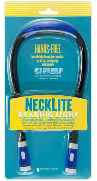 Nakładana na szyję lampka marki Peter Pauper Press. Idealna do czytania, majsterkowania, na biwak do podróży lub robienia na drutach. Elastyczną lampke można nosic na szyi, zawinąć wokoł przedmiotu lub postawić i używać jak zwykłej lampi na biurko. Podwójne lampki moga świecić pod różnymi kątami, zapewniając jaśniejsze oświetlenie i mniej cieni. W każdej końcowce znajdują się po 3 diony LED dające światło punktowe lub szerokokątne, możliwe są 3 ustawienia jasności. Natężenie światła 40 lumenów. Lampka posiada wygodną podkladkę pod szyję. Pokryte elastyczną, trwałą i miłą w dotyku gumą piankową ramiona wyginają się w dowolnych kierunkach, całkowita długość to 55,9cm. Lampka zasilana jest na dwie baterie AAA (nie dołączone do zestawu). Produkt nie jest zabawką i nie nadaje się dla dzieci poniżej 12-go roku życia.