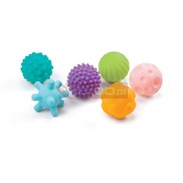 - Poznawanie, zmysły: maluch bada powierzchnię piłek sensorycznych paluszkami, odkrywając wytłoczone na nich wzory; dwie piłeczki wydają przy zgnieceniu dźwięk,