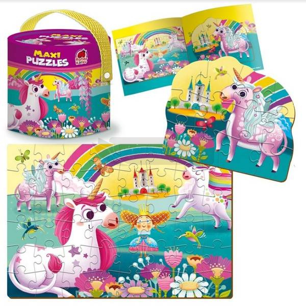 Puzzle w tubie. 2 zdjęcia przedstawiające jednorożce. Właściwości: oryginalne opakowywanie, mocna tekura. Zestaw: 48 i 15 elementów.
