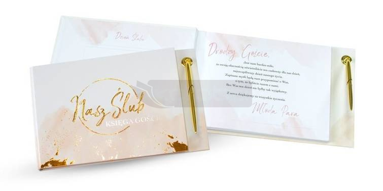 Księga gości Happy Book HBP-001 (prostokątna). Dzień ślubu pozostaje na zawsze w pamięci Młodej Pary. Ten dzień pełen szczególnych emocji wymaga wyjątkowej oprawy. Aby upamiętnić ten jedyny w swoim rodzaju moment życia Kukartka stworzyła piękne Księgi gości. Happy Book to album, który pozwoli zachować wspomnienia z tego najważniejszego dnia. Wpisy gości, zapiski, wspomnienia i złote myśli przetrwają przez całe życie. Dołożyliśmy wszelkich starań, aby nasz produkt był trwały, elegancki i najwyższej jakości (jak to zwykle w Kukartce). 40 białych kart na wpisy poprzedzonych jest stroną tytułową oraz miejscem na zdjęcie. Ekskluzywna okładka zdobiona jest złotą lub srebrną folią (hot Stamp). Dla ułatwienia (i lepszego efektu) dołączamy elegancki długopis doskonale uzupełniający całość. Wymiar 265mm x 170mm. Całość jest zapakowana w eleganckie i trwałe pudełeczko. To produkt z najwyższej półki godny tego wyjątkowego dnia.