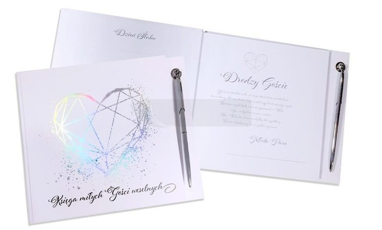 Księga gości Happy Book HBK-003 (kwadratowa). Dzień ślubu pozostaje na zawsze w pamięci Młodej Pary. Ten dzień pełen szczególnych emocji wymaga wyjątkowej oprawy. Aby upamiętnić ten jedyny w swoim rodzaju moment życia Kukartka stworzyła piękne Księgi gości. Happy Book to album, który pozwoli zachować wspomnienia z tego najważniejszego dnia. Wpisy gości, zapiski, wspomnienia i złote myśli przetrwają przez całe życie. Dołożyliśmy wszelkich starań, aby nasz produkt był trwały, elegancki i najwyższej jakości (jak to zwykle w Kukartce). 40 białych kart na wpisy poprzedzonych jest stroną tytułową oraz miejscem na zdjęcie. Ekskluzywna okładka zdobiona jest złotą lub srebrną folią (hot Stamp). Dla ułatwienia (i lepszego efektu) dołączamy elegancki długopis doskonale uzupełniający całość. Wymiar 265mm x 230mm. Całość jest zapakowana w eleganckie i trwałe pudełeczko. To produkt z najwyższej półki godny tego wyjątkowego dnia.