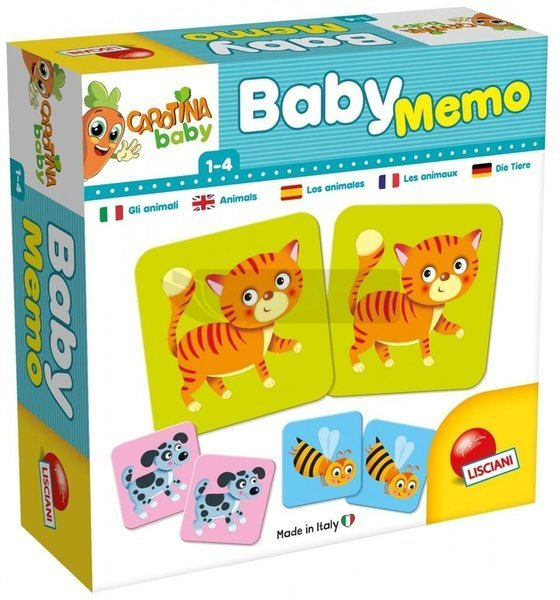 Gra memoria zwierzęta to gra, która rozwija pamięć. Zadaniem dzieci jest dopasowywanie do siebie par obrazków z kolorowymi zwierzętami. Seria Carotina Baby to seria Lisciani, skierowana do dzieci w wieku 0-3 lat.