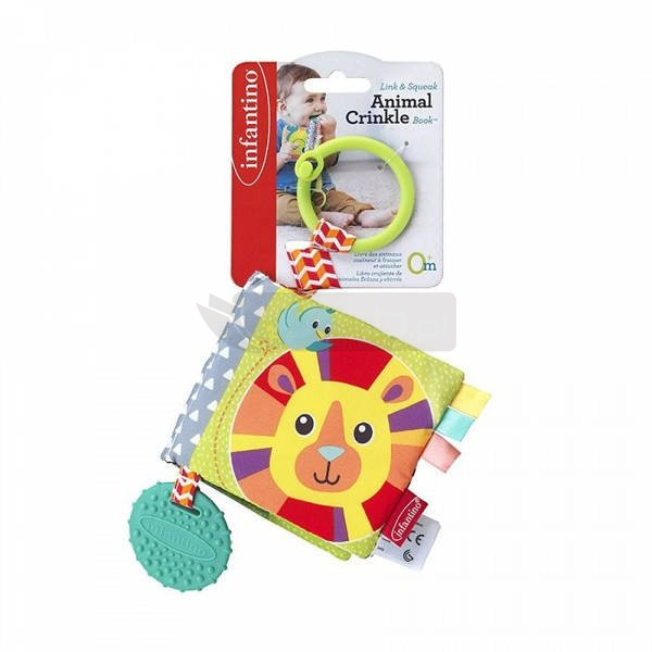 Kolorowa książeczka wyposażona w gryzaczek o różnych fakturach. Zawiera 4 strony - na każdej 2 inne zwierzątka. Ostatnia strona zawiera piszczałkę, a strony szeleszczą co zwróci uwagę dziecka. Książeczka posiada kółeczko z zaczepem i tasiemkę dzięki czemu można ją przywiesić w dowolnym miejscu. Pasuje do wózków, fotelików samochodowych, mat. Jasne, kontrastowe kolory zaangażują dziecko wzrokowo.
