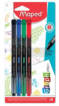 Cienkopis Graph'Peps Deco. Uniwersalna linia cienkopisów dla każdego, do użycia w szkole, w domu i w biurze. Końcówka oprawiona w metal. Grubość końcówki 0,4mm. Bezpieczna, wentylowana skuwka z klipsem. Ergonomiczny, trójkątny kształt poprawia komfort pisania. Korpus zdobiony błyszczącymi wzorami w kolorze tuszu. Blister 4 szt. kolory basic (czarny, niebieski, zielony, czerwony).