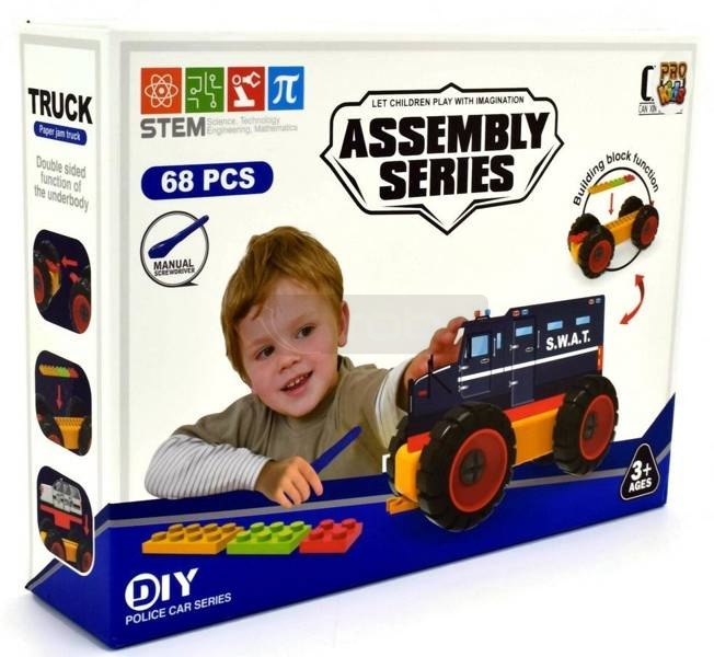 Pojazd do skręcania to idealna zabawka dla małego konstruktora. Zestaw składa się z 68 elementów tj klocki, koła, podwozie oraz nadwozie samochodu. Aby ułatwić budowę samochodu w zestawie znajdziesz specjalny klucz.