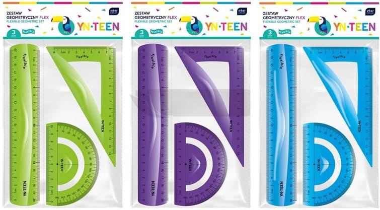 Supergiętkii odporny na złamania i uszkodzenia. W zestawie: linijka 20 cm, ekierka prostokątna i kątomierz. Dostępny w trzech opcjach kolorystycznych.