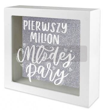 Skarbonka wykonana jest z MDFU i szkła, jest zapakowana w kolorowe pudełko,