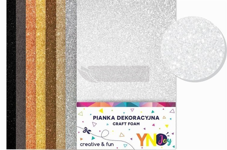 Opakowanie zawiera 8 arkuszy pianek w rozmiarze A4 w odcieniach złota i srebra, jednostronnie pokrytych brokatem.