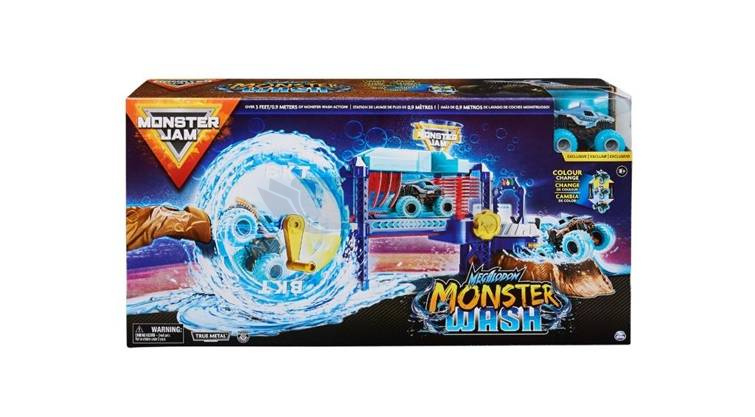 Myjnia Megalodon Monster to najlepszy sposób na usunięcie zabrudzeń! Jest długa na prawie metr i potrafi oczyścić z brudu wszystkie kompatybilne trucki Monster Jam. Wyposażona jest w zmieniającą kolor technologię, myjkę ciśnieniową, działający przenośnik taśmowy, wirujące szczotki i system suszenia jak w prawdziweej myjni samchodowej! Zawiera ekskluzywny, zmieniający kolor monster truck Megalodon w skali 1:64. Wjedź Megalodonem po rampie do myjni. Zamknij myjnię i zakręć, aby ruszył cykl szalonego mycia! Obserwuj, jak monster truck Megalodon zmienia kolory i pojawiają się jego czyste elementy wykończenia! Zanurz zmieniającego kolory Magalodona w ciepłej wodzie i obserwuj, jak plamy brudu znikają. Polej go lodowatą wodą, żeby brud pojawił się znowu! Pozwól mu pojechać przenośnikiem taśmowym przez obracające się szczotki, aby został wyszorowany. Czas pochwalić się jego dekoracjami! Możesz pobrudzić go znowu albo zjechać po zjeżdzalni i cieszyć się nieskazitelnym stylem Megalodona! Zestaw myjnia Megalodon daje tyle sposobów na zabawę! Jest kompatybilna z każdym monster truckiem Monster Jam w skali 1:64. Aby zdobyć jeszcze więcej zmieniających kolor pojazdów, znajdź dowolny dwupak Dirt to Clean w skali 1:64, który zawiera Grave Diggera, Eart Shakera, Pirate's Curse czy Bluee Thunder (sprzedawane osobno). Idealny prezent dla dzieci, które kochają zabawy w wodzie, samochody wyścigowe i świat Monster Jam! Przenieś do domu akcję znaną z Monster Jam dzięki myjni Megalodon Monster.