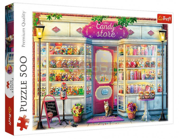 Puzzle składające się z 500 elementów przedstawiające sklepik ze smakowitymi słodyczami. Po ułożeniu powstanie obrazek o wymiarach 580 x 340 mm. Produkt został wykonany z wysokiej jakości materiałów, z zastosowaniem specjalnego kalandrowanego papieru odbijającego światło, co ułatwia układanie. Produkt został wyprodukowany w Polsce, a do produkcji zostały użyte materiały ekologiczne.