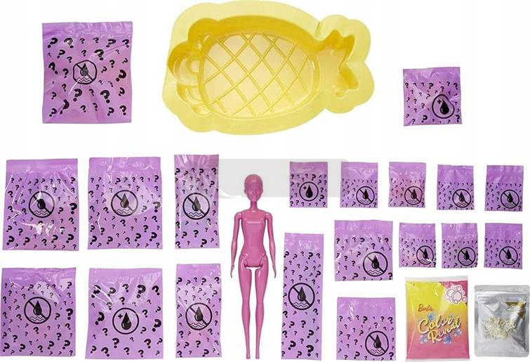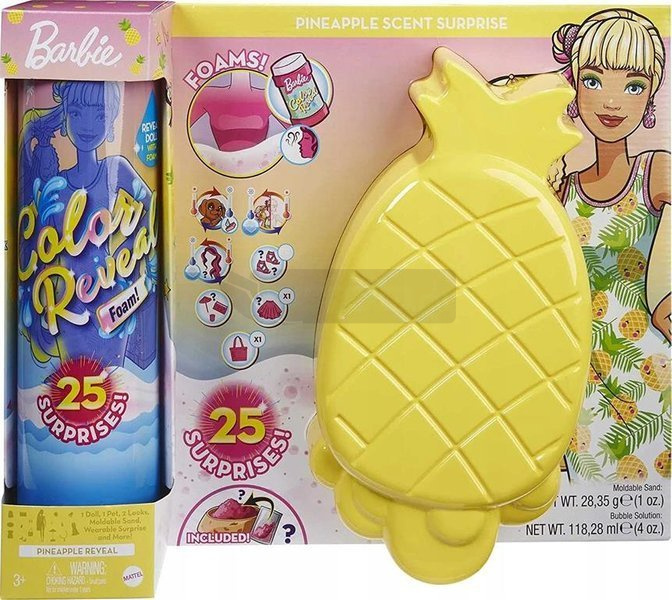 Te wspaniałe zestawy Barbie® Color Reveal™ Wakacyjna Barbie® kryją mnóstwo niespodzianek! Te zestawy Barbie Color Reveal Piana Pachnąca niespodzianka kryją mnóstwo niespodzianek – w tym sensorycznych! W każdym z nich jest lalka, ale jej wygląd pozostaje na razie tajemnicą. Wlej do tubki dołączony zapachowy płyn i potrząśnij. Wytworzy się piana, a Ty odkryjesz wygląd lalki! Opakowanie jest częścią zabawy – znajdziesz tam basen dla lalki i inne niespodzianki. W zestawie jest 1 lalka, 1 figurka zwierzątka, 2 stylizacje, piasek do formowania, akcesorium do noszenia i nie tylko. Do przechowywania akcesoriów użyj tubki z zestawu.