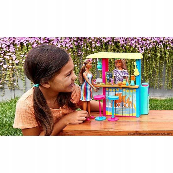 Dzięki ponad 18 akcesoriom, w tym inspirowanym wyspą napojom, rożkom do lodów, blenderowi i przekąskom, Barbie® Plażowy Bar to idealne miejsce, aby się ochłodzić i cieszyć się pysznym smakołykiem w upalny dzień!
