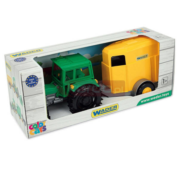 Traktor z serii Color Cars z przyczepą na konia. Pojazd charakteryzuje się realistycznym odwzorowaniem, solidnym wykonaniem, lekkością i wytrzymałością konstrukcji oraz łatwością sterowania. W zestawie znajduje się otwierana przyczepa z rozkładanym najazdem i figurka konia. Traktor posiada ruchome elementy uatrakcyjniające zabawę, takie jak podnoszona kabina i maska oraz skrętną przednią oś. Zabawa traktorem z przyczepą poszerzy informacje najmłodszych o otaczającym świecie, nasze pociechy dowiedzą się jak przebiega transport zwierząt oraz szybko przetransportują swoje figurki zwierząt po domu lub zabiorą je na wycieczkę do parku czy na podwórko.