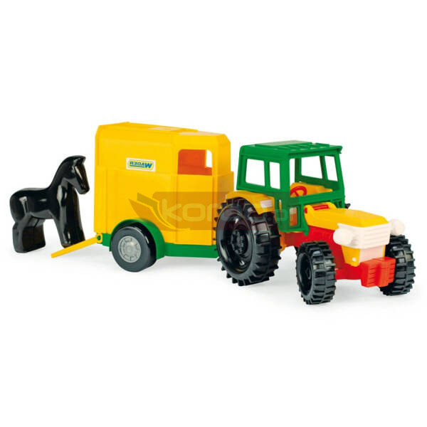 Pojazd charakteryzuje się realistycznym odwzorowaniem, solidnym wykonaniem, lekkością i wytrzymałością konstrukcji oraz łatwością sterowania. W zestawie znajduje się otwierana przyczepa z rozkładanym najazdem i figurka konia. Traktor posiada ruchome elementy uatrakcyjniające zabawę, takie jak podnoszona kabina i maska oraz skrętną przednią oś. Zabawa traktorem z przyczepą poszerzy informacje najmłodszych o otaczającym świecie, nasze pociechy dowiedzą się jak przebiega transport zwierząt oraz szybko przetransportują swoje figurki zwierząt po domu lub zabiorą je na wycieczkę do parku czy na podwórko.