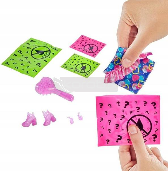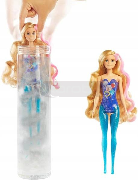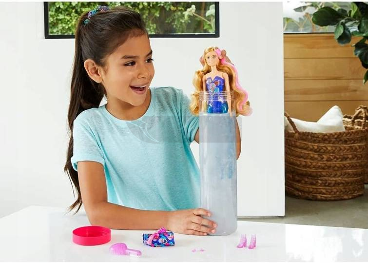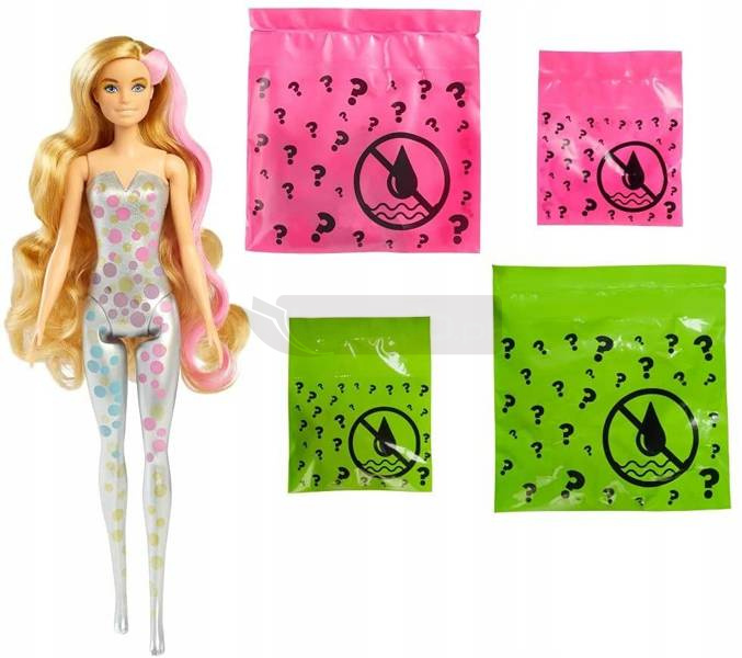 Poczuj magię swojej ulubionej lalki, jakiej nigdy wcześniej nie widziałeś! Odkryj niespodzianki lalki Mattel Barbie Color Reveal w wersji imprezowej! Najnowsza seria lalek Barbie, które są gotowe na wspaniałą imprezę! Lalki Barbie Color Reveal inspirują od razu po rozpakowaniu i zawierają aż siedem niespodzianek. Każda lalka ma na sobie jaskrawy strój imprezowy, który zostanie ujawniony dopiero później. Rozpakowywanie jest również zabawne: wystarczy pociągnąć za zakładkę, aby wyjąć zewnętrzne opakowanie i odsłonić przezroczysty pojemnik. Wewnątrz znajduje się srebrzysta lalka Color Reveal z kolorowym nadrukiem konfetti oraz cztery woreczki-niespodzianki. Wyjmij wszystko i napełnij pojemnik wodą, a następnie zanurz lalkę w wodzie i obracaj ją tam i z powrotem. Woda zamienia się w metaliczne srebro, a wokół wirują kolorowe konfetti - a po zdjęciu lalki ujawnia się jej wygląd. Każda lalka ma inną kombinację koloru oczu, fryzury, karnacji, błyszczącego topu i wymodelowanych brokatem nóg . A niespodzianek jest jeszcze więcej: w torebkach znajdziemy spódniczkę z falbanami, parę butów, błyszczące kolczyki i pędzelek w kształcie serca z gąbką. Efekty zmiany koloru na włosach, powiekach i ustach lalki dodają dodatkowego efektu wow.