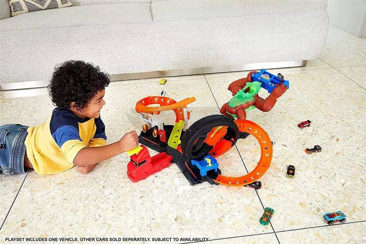 Toksyczny goryl atakuje stację benzynową i warsztat w mieście Hot Wheels, próbując zmiażdżyć je ogromnym transporterem!