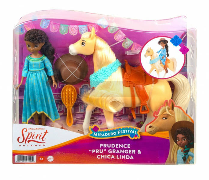 Poczuj atmosferę przyjaźni, odwagi i przygody znaną z animacji Mustang: Duch wolności! W tym zestawie Festiwal z lalką i figurką konia znajdziesz Lucky i Ducha. Lalki (ok. 17,5 cm) są ubrane w śliczne sukienki idealne na festiwal, a do tego każda z nich ma szczotkę do włosów oraz ozdobę z kwiatów lub kapelusz. Konie (ok. 20 cm) zachwycają długimi, grzywami. Wśród przeznaczonych dla nich akcesoriów są girlanda z kwiatów oraz siodło lub kocyk. Każdy koń ma też uchwyt na lalkę, który pozwala im wspólnie bawić się na festiwalu albo pogalopować w siną dal. Sprzedawane oddzielnie, zależnie od dostępności. Kolory i elementy dekoracyjne mogą się różnić. To wspaniały prezent dla dzieci od 3 roku życia.
